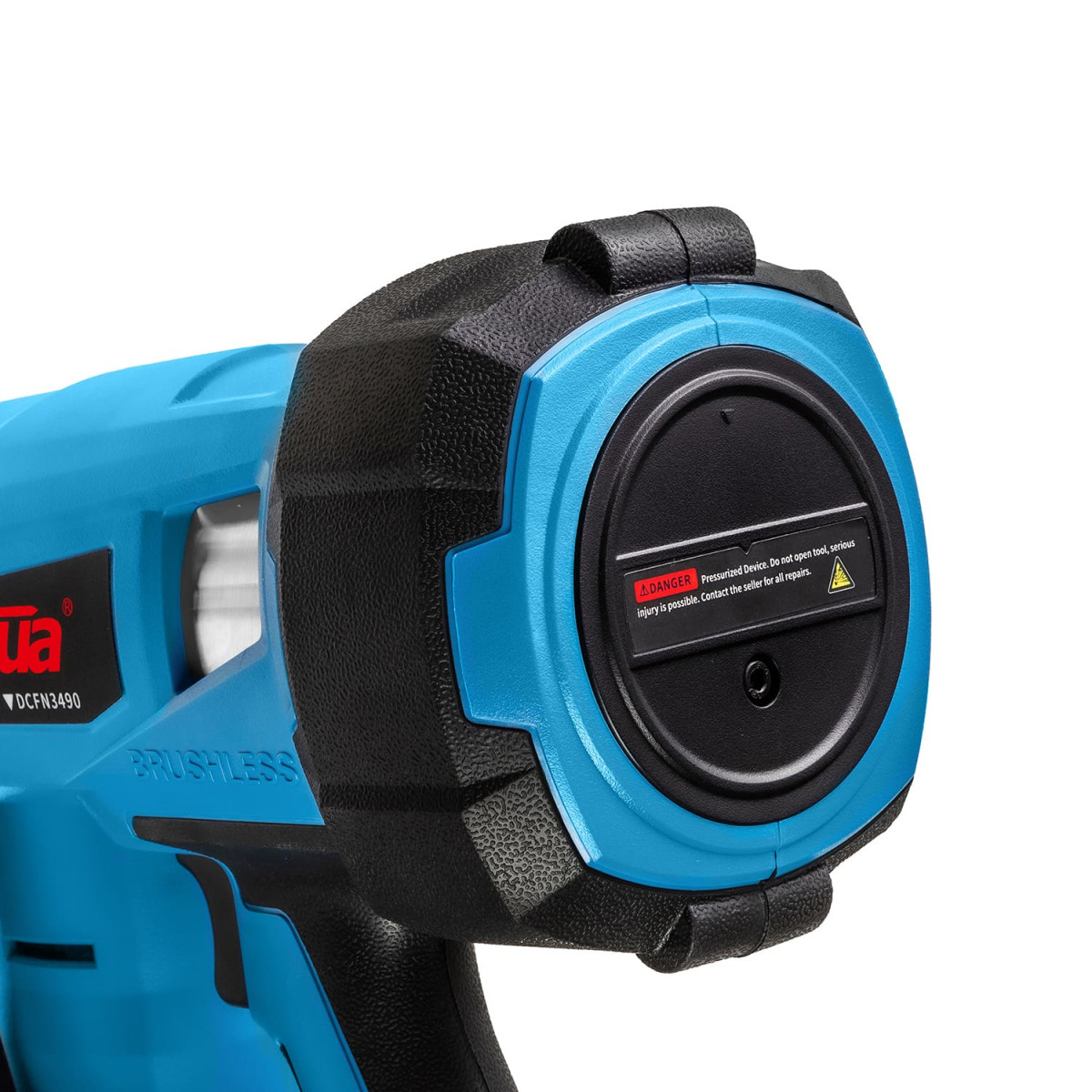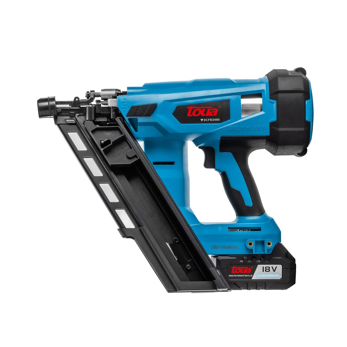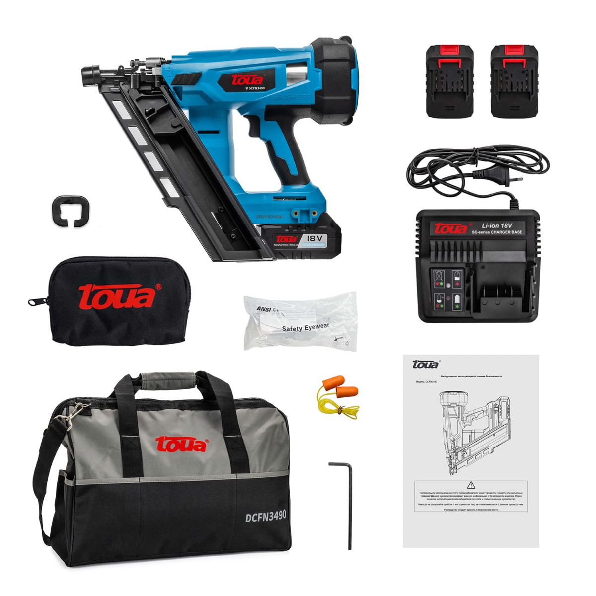 Toua DCFN3490 — це потужний акумуляторний каркасний нейлер (framing nailer) безгазового типу, розроблений для професійних робіт по дереву, включаючи каркасне домобудівництво, монтаж OSB, обрешітку, кроквяні системи та інші великомасштабні дерев'яні конструкції. Ця модель працює виключно від акумулятора і не потребує газових балонів, що значно спрощує експлуатацію та обслуговування.
