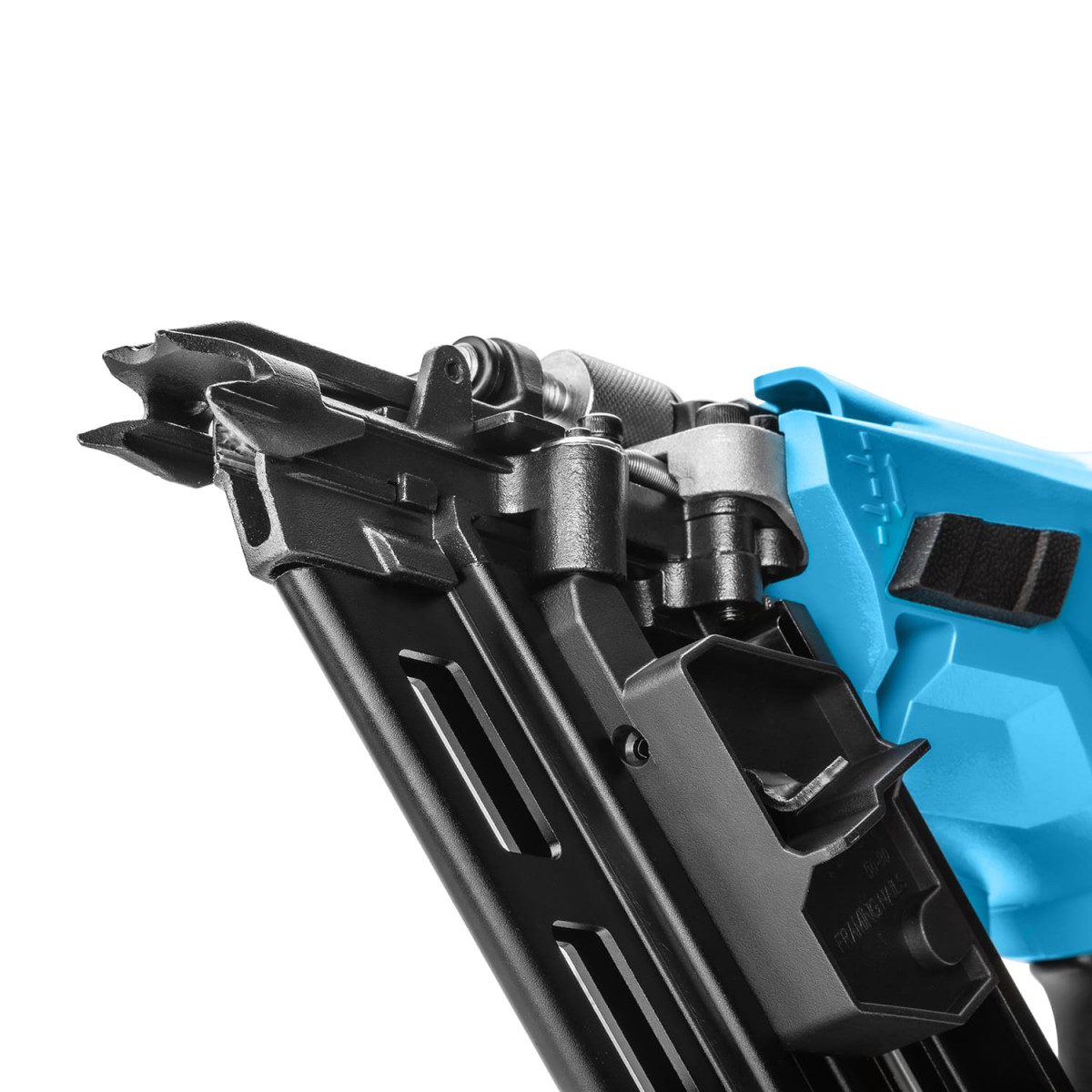 Пістолет оснащений високопродуктивним безщітковим двигуном і має значну енергію вистрілу 105 Дж, що дозволяє надійно забивати довгі рейкові цвяхи (до 90 мм) навіть у щільну деревину. Він використовує стандартні рейкові цвяхи на паперовій касеті під кутом 34°. Відсутність газового механізму забезпечує м'який притиск та короткий хід ствола для активації, що робить роботу швидшою і комфортнішою.