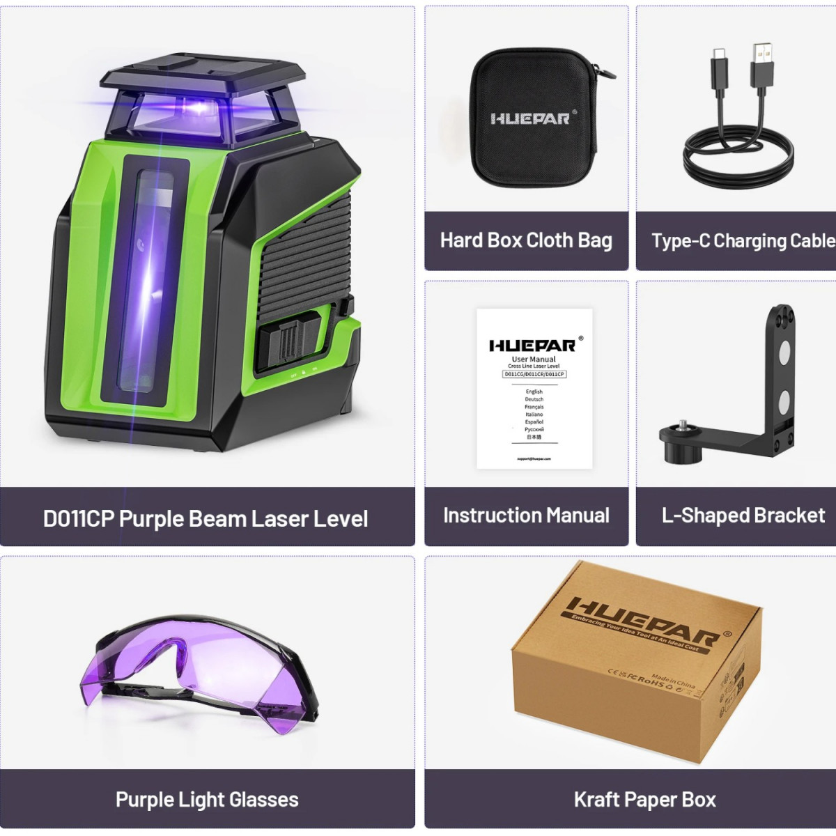 Лазерний рівень (артикул ) — це інноваційний і високоточний будівельний нівелір, розроблений для професійної розмітки та вирівнювання у будівництві та ремонті. Унікальною особливістю даної моделі є використання фіолетового лазера ( ), який забезпечує чудову видимість і високий контраст у порівнянні з традиційними червоними або зеленими променями, особливо в яскраво освітлених приміщеннях. Це робить Huepar D011CP ідеальним вибором для малярів, плиточників, монтажників та всіх, кому необхідна бездоганна точність.