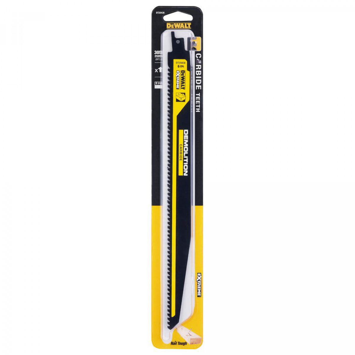 DeWALT DT20438 — це високопродуктивне карбідне полотно (Tungsten Carbide Technology) з інноваційної серії EXTREME CARBIDE. Воно спеціально розроблене для використання з сабельними пилами (Reciprocating Saws), особливо для найбільш вимогливих демонтажних робіт у деревині з цвяхами та іншими металевими включеннями.