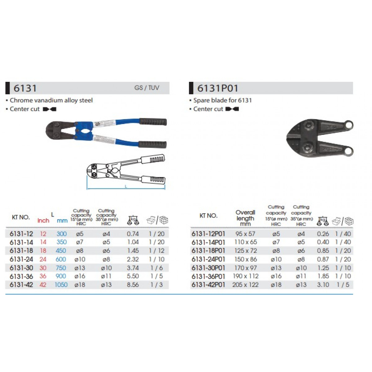 Шматочки - болторізи 760мм KINGTONY 6131-30 Болторізи 750 мм – слюсарний інструмент для швидкого демонтажу різьбових з'єднань. За рахунок посиленого шарнірного механізму, пристрій за лічені секунди перекушує болти, гайки, арматуру, троси та інші металеві конструкції. Болторізи затребувані в автосервісі та будівництві, де слюсарям доводиться працювати із заржавілими або прикипілими елементами кріплення. Зручність у роботі та стійкість до відмови – переваги болторізів бренду King Tony. Виготовлені з легованої інструментальної сталі, з додаванням хрому та ванадію, кусачки з легкістю впораються з будь-яким кріпленням. Відмінне захоплення та посилений шарнірний механізм для стиснення робочих поверхонь гарантують слюсарю безвідмовність у роботі професійного пристосування. Габарити інструменту та вага підібрані так, щоб не викликати дискомфорт під час роботи у важкодоступних місцях вузлів та механізмів. Але й сили стиснення достатньо для перекушування габаритних елементів кріплення. Рукоятки болторізів прогумовані – додаткове рифлення накладок покращує хват інструменту. Пристрій вважається обслуговується – відрізні ножі демонтуються для заміни або заточування.
