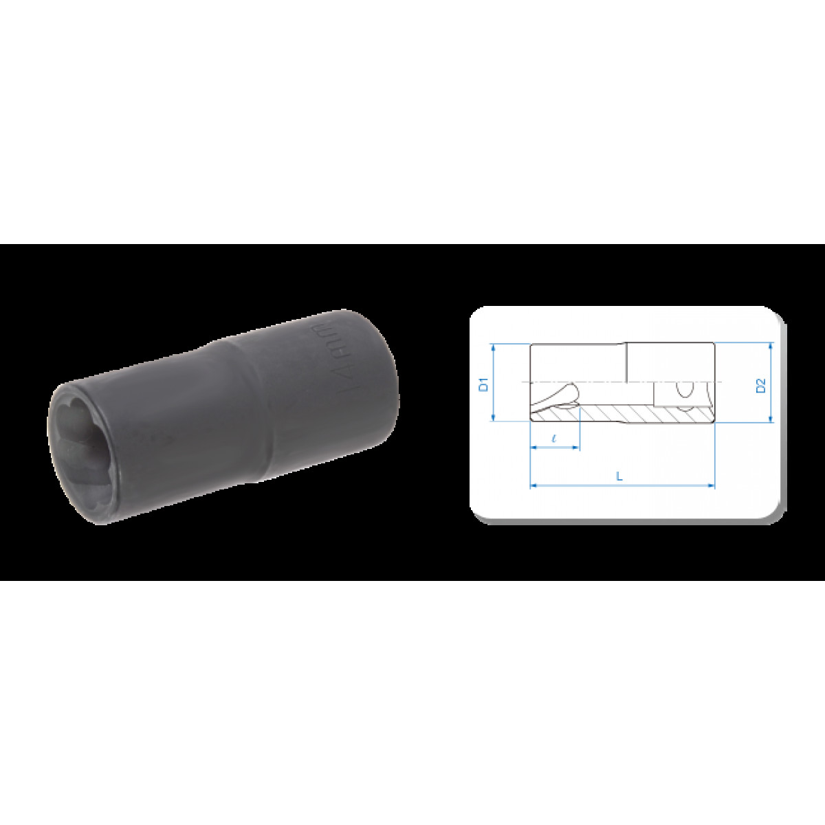 Головка для пошкоджених гайок 13 мм D1 = 20 мм D2 = 22 мм l = 11 мм L = 50 мм Головка торцева для пошкодженого кріплення 13 мм King Tony 9TD403-13M Призначена для демонтажу гайок або болтів, грані яких сильно пошкоджені та відкрутити стандартною головкою або ключем таке кріплення практично неможливо. Також важко і з проржавілими деталями – стандартні інструменти провертаються, не досягаючи своєї мети. Головка має спеціальну насічку, яка надійно врізається в проблемний болт або гайку, допомагаючи легко демонтувати їх. Виготовлена з легованої сталі з додаванням молібдену (сталь SNCM), що надає інструменту особливої міцності та високої зносостійкості при впливі високих навантажень. Не використовуйте головку для пошкодженого кріплення разом із ударним пневматичним гайковертом. Діаметр робочої частини головки (D1): 20 мм Діаметр з боку посадкового квадрата (D2): 22 мм Глибина насічки: 11 мм