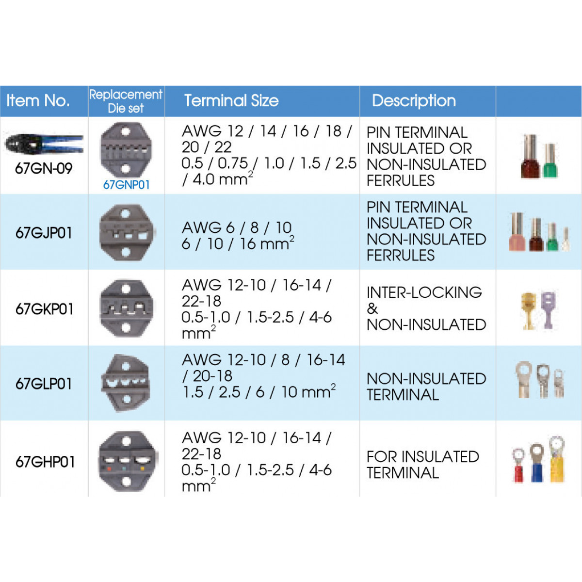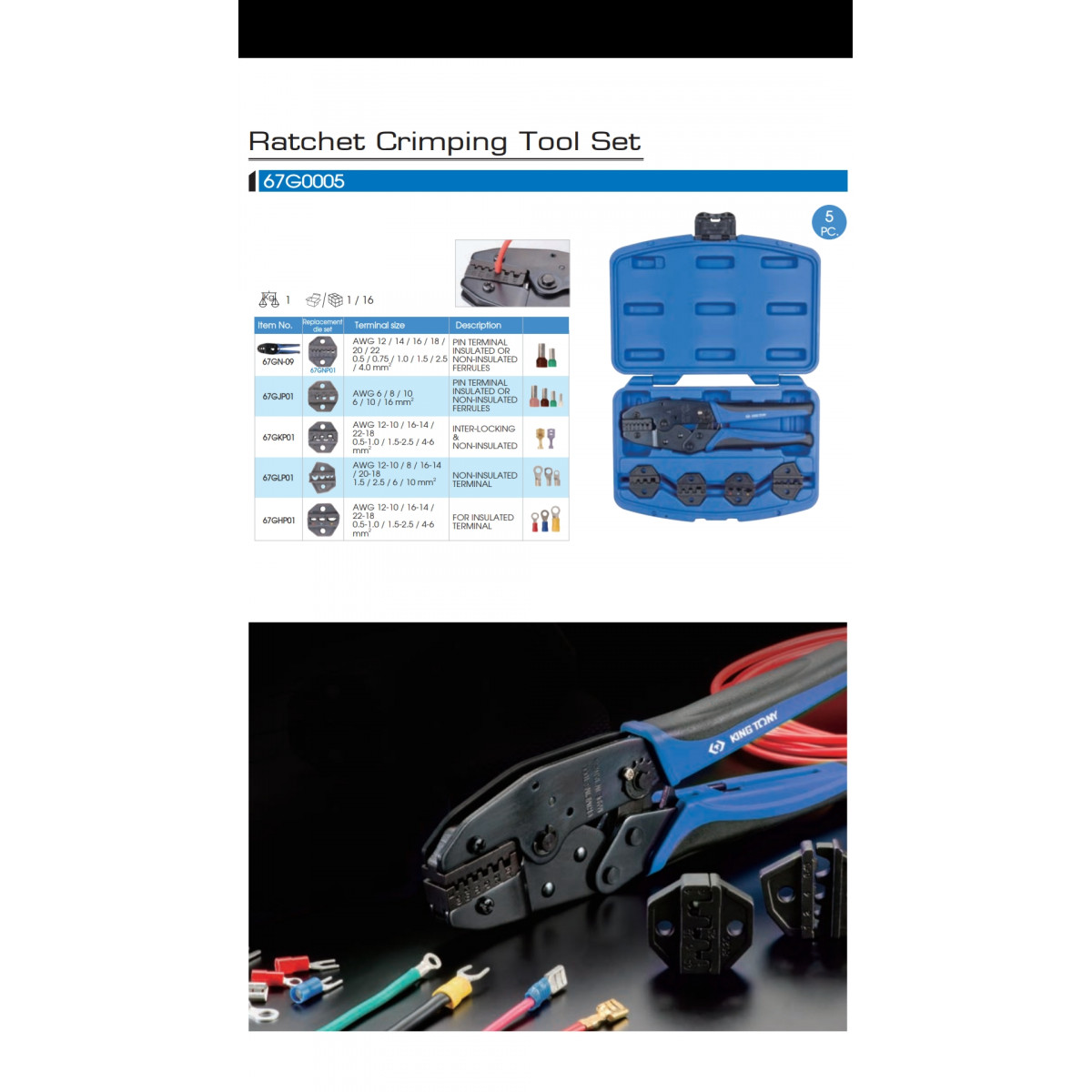 Кримпер храповичний для обтиску ізольованих наконечників із 5 предметів, автомеханіки вважають за краще називати ручним обтискним інструментом. Продукт вважається професійним обладнанням, але популярний у побуті серед електриків, які цінують комфортабельність у роботі та безпеку. Виробник King Tony запевняє, що одного разу скориставшись кримпером, користувач назавжди відмовиться від скручування багатожильної проводки вручну і витратної пайки. Контроль зусилля для кримпера храповичного у пріоритеті, адже майбутньому власнику важливий позитивний результат, а не пошкоджений або слабко обтиснутий кабель. Технологи компанії King Tony розрахували стиск та гарантують користувачеві безвідмовність у роботі. Для зручності власника рукоятки інструменту оснащені гумовими накладками, які додатково захищають власника від ураження електричним струмом. У комплекті з кримпером поставляються 5 обтискань для вилкових та кільцевих наконечників, а також пластиковий кейс для зберігання та транспортування ручного інструменту. Виріб виготовлений із легованої інструментальної сталі. Механізм кримпера простий і унеможливлює пошкодження внаслідок проникнення в шарніри сміття, піску та пилу. Кримпер храповичний для обтиску наконечників, змінні модулі 67G довжина 222 мм Модуль змінний 67GNP01 для опресування втулкових наконечників перерізом: 0.5, 0.75, 1.0, 1.5, 2.5, 4.0 кв.мм Модуль змінний 67GJP01 для опресування втулкових наконечників перерізом: 6, 10, 16 кв.мм Модуль змінний 67GKP01 для опресування автоклем подвійним обтисканням перетином: 0.5-1.0, 1.5-2.5, 4.0-6.0 кв.мм Модуль змінний 67GLP01 для опресування неізольованих наконечників перетином: 1.5, 2.5, 6.0, 10.0 кв.мм Модуль змінний 67GHP01 для опресування ізольованих наконечників перетином: 0.5-1.0/1.5-2.5/4.0-6.0 кв.мм Особливості • Храповичний (тріскачковий) механізм для зручності роботи • Змінні модулі для різного типу наконечників та клем • Ізольовані рукоятки • Пластиковий кейс Профіль: спеціальний Матеріали: інструментальна сталь, конструкційна сталь, пластик PP Упаковка: коробка картон Габарити: 240 х 70 х 50 мм Вага: 1,0 кг