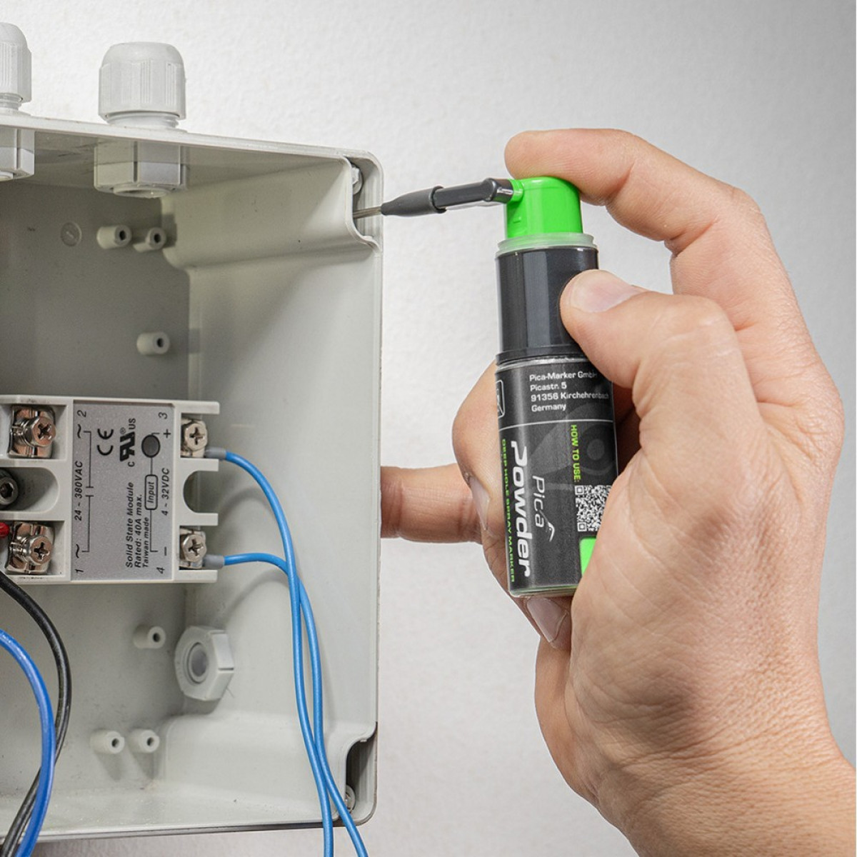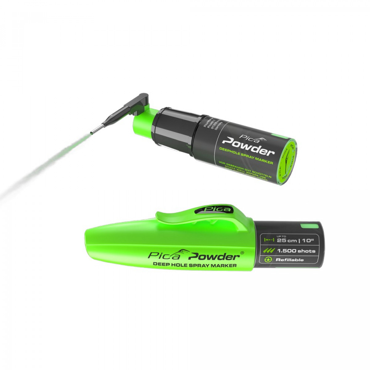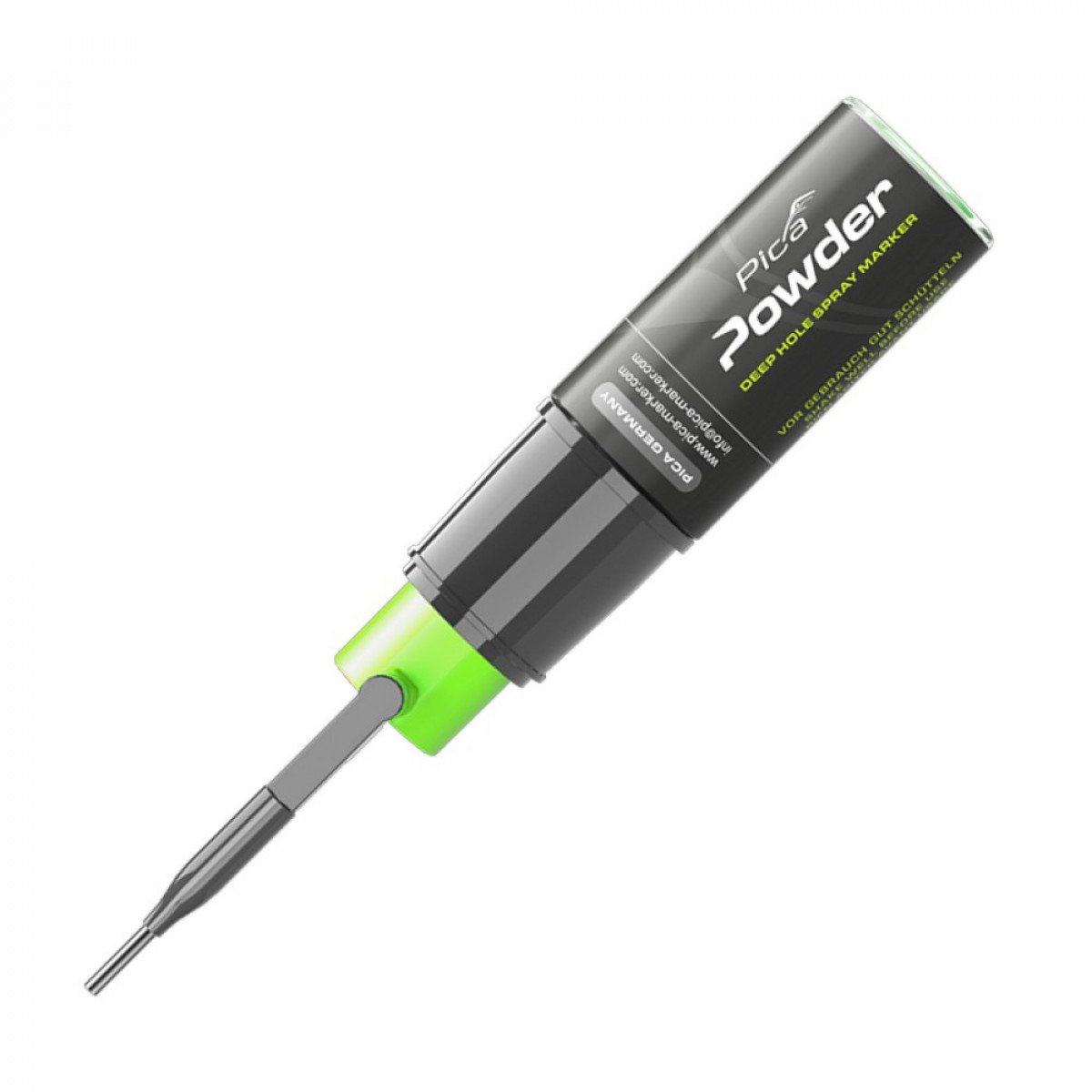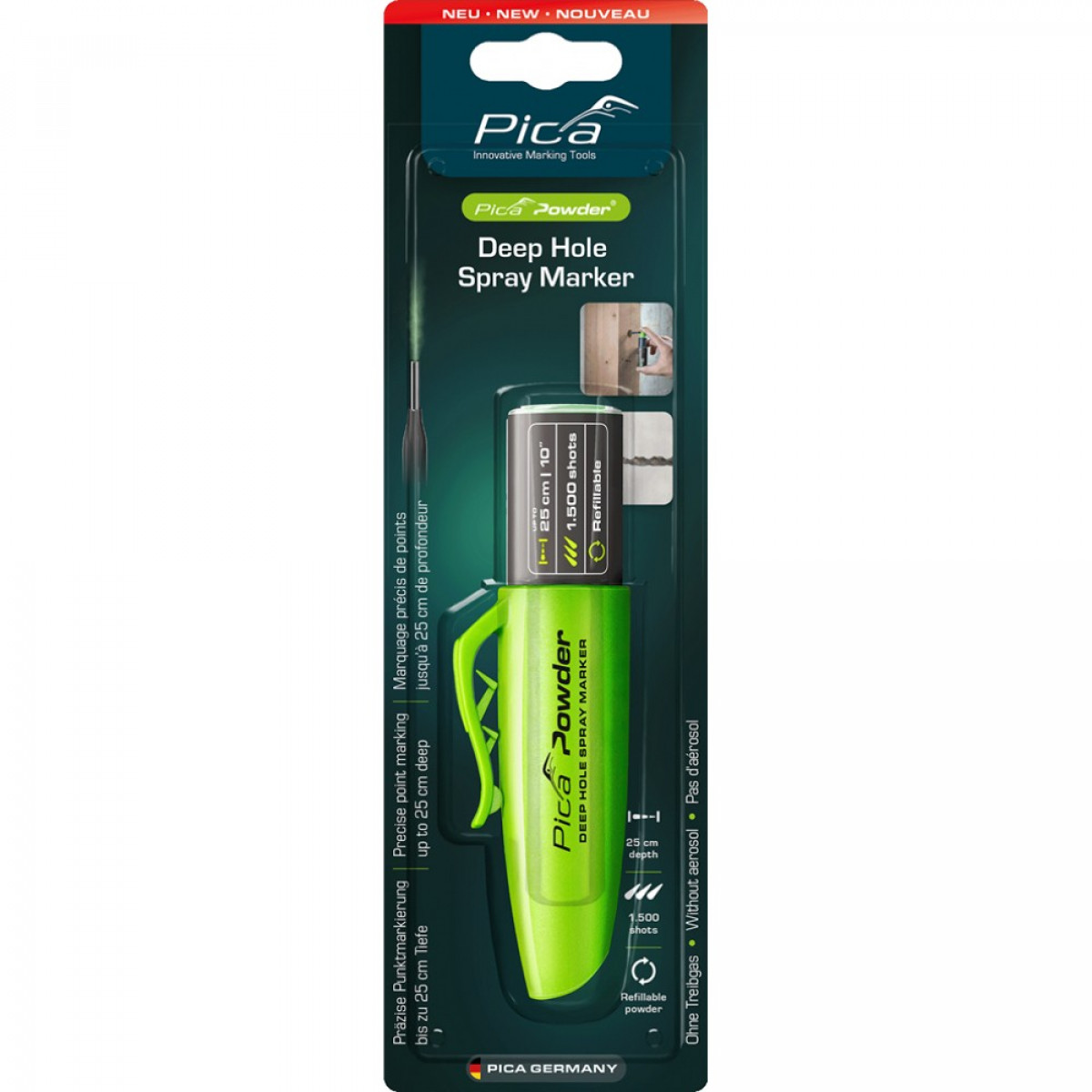 Маркер-спрей PICA Powder для глубоких отверстий (2020/SB) — инновационный порошковый маркер-спрей для быстрой и точной разметки в глубоких отверстиях до 25 см. Не содержит аэрозоля и не находится под давлением, поэтому абсолютно безопасен в использовании даже у открытого огня. Идеально подходит для маркировки при электромонтажных, сантехнических, строительных и деревообрабатывающих работах.