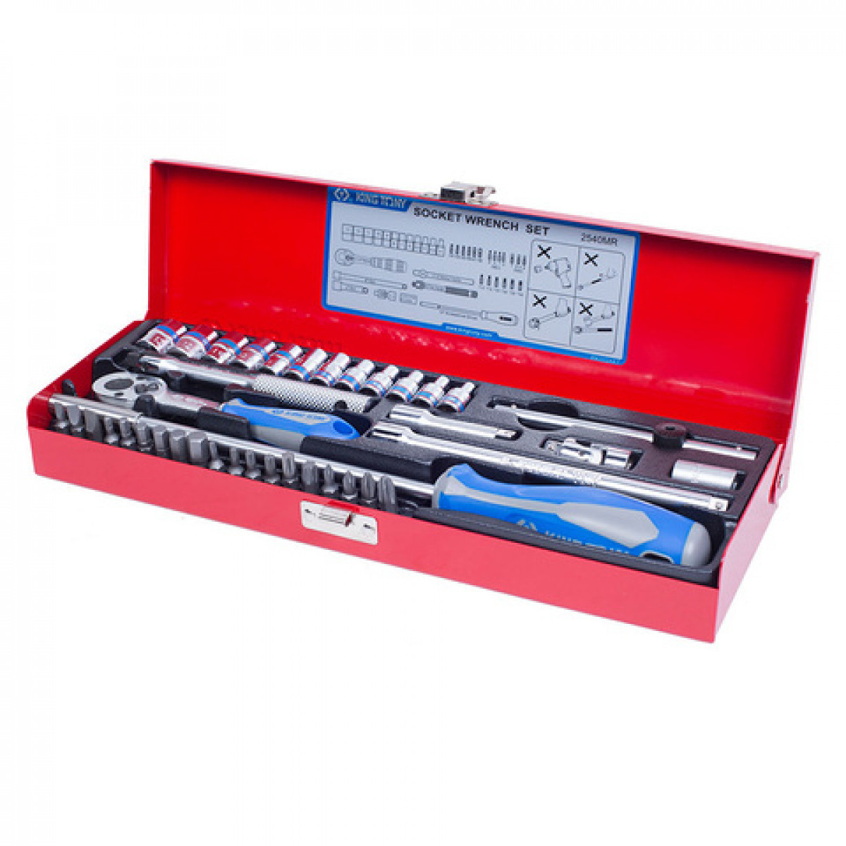 Набір інструментів 40 од. 1/4" KINGTONY 2540MR Головки торцеві 1/4" 6-гранні: 4, 4.5, 5, 5.5, 6, 7, 8, 9, 10, 11, 12, 13 мм Вставки 1/4" TORX: T10, T15, T20, T25, T30, T40 Вставки 1/4" хрест: PH0, PH1, PH2, PH3 Вставки 1/4" шестигранники: H3, H4, H5, H6, H7, H8 Вставки 1/4" шліцеві: SL4, SL5.5, SL7 Тріскачка 1/4" з прапорцевим перемиканням 130 мм Викрутка-бітоутримувач магнітний: 300 мм Перехідник-бітоутримувач 1/4">1/4" Вороток ковзний: 115 мм Кардан 1/4" Вороток шарнірний 1/4": 130 мм