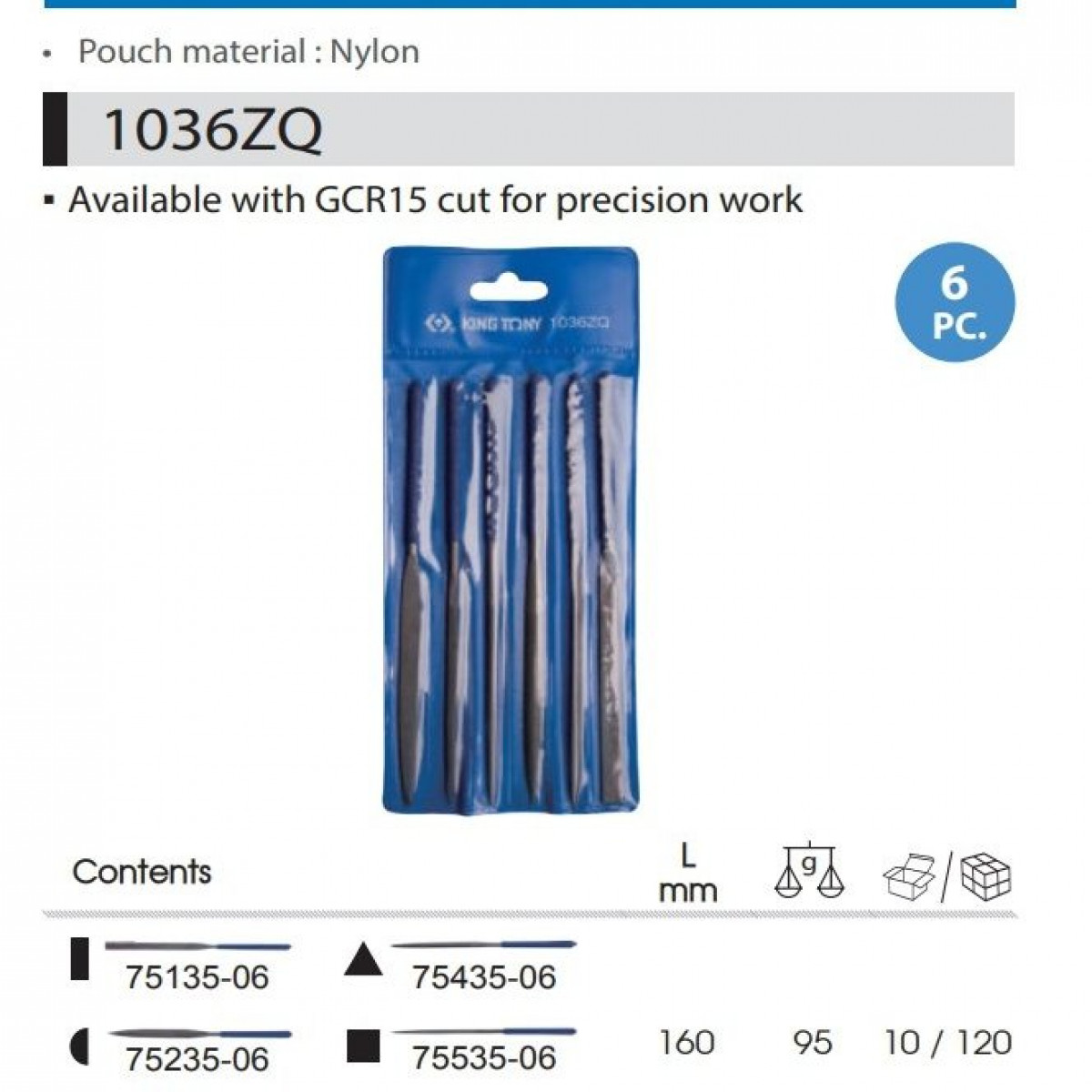Набір надфілів 6 одиниць – слюсарний інструмент для роботи з металу. Надфіль – невеликий напилок із мікроскопічною насічкою. Інструмент виготовляється з високовуглецевої сталі та застосовується для обробки чи зачистки зовнішніх та внутрішніх поверхонь деталей. Набір поставляється в м'якій ПВХ упаковці, що дозволяє довгострокове зберігання та транспортування інструменту. Набір King Tony включає надфілі наступних профілів: • з прямокутним всебічним перетином; • круглий; • сегментний (напівкруглий); • трикутний всебічний; • із квадратним всебічним перетином; • плоский (двостороння пилка). Виробник: King Tony Країна виробник: Тайвань Тип інструменту: слюсарний, для механічної обробки металоконструкцій Матеріал: високовуглецева сталь Оздоблення: рукоятка із твердого пластику Розмір: довжина 160 мм Вага набору: 95 грам Кількість наборів в упаковці – 10, у ящику – 120 штук.