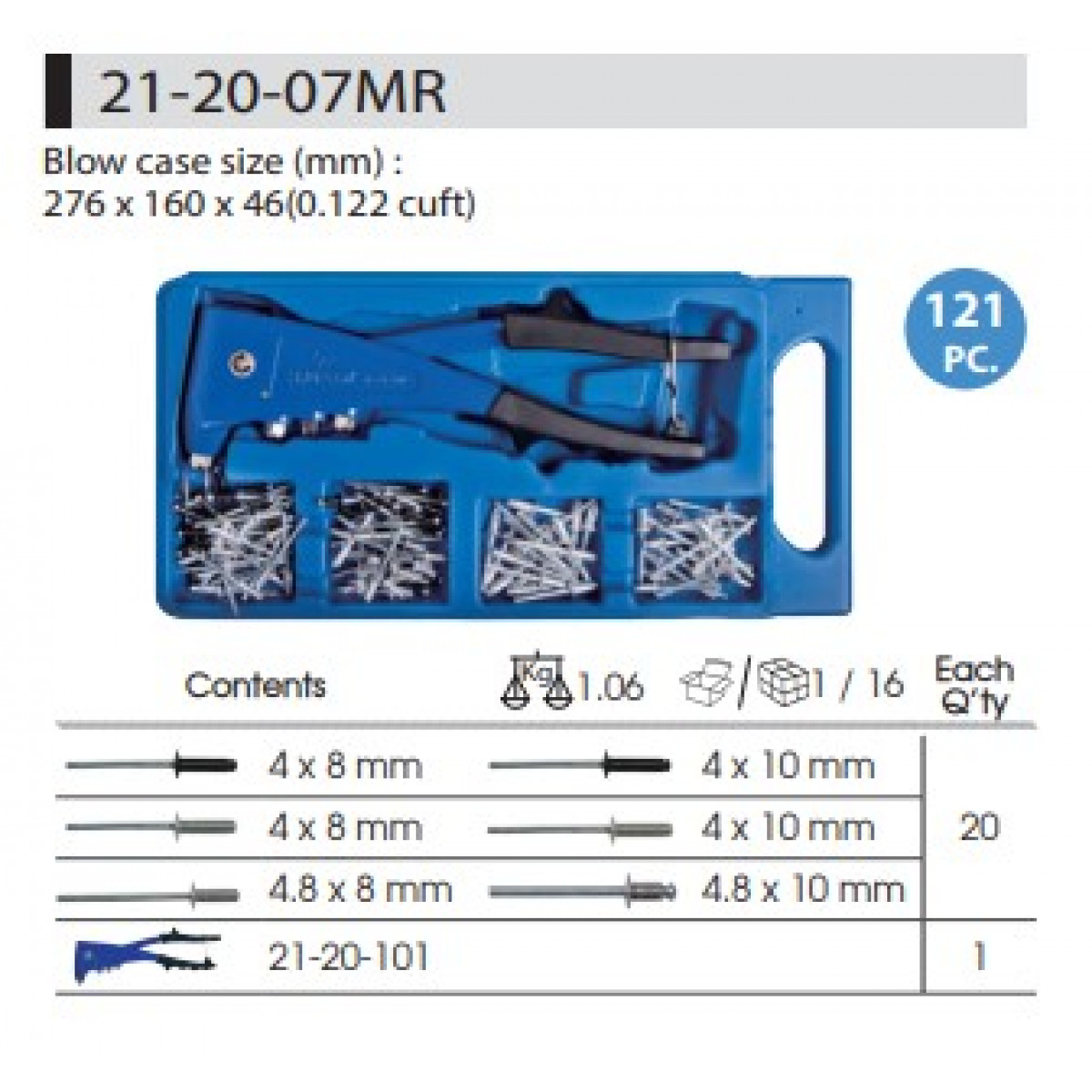 Заклепочник з набором заклепок, 121 предмет KING TONY 21-20-07MR. Заклепочник призначений для з'єднання листового металу, деталей конструкцій, а також виконання монтажних робіт різного характеру. Як сполучні елементи застосовуються спеціальні заклепки витяжного типу. Заклепочник оснащений затискними губками із твердосплавної сталі, адаптерами для заклепок різного діаметру, спеціальним ключем, ергономічними рукоятками із гумопластику. Заклепочник з комплектом заклепок розташований у кейсі, зручному для зберігання або транспортування, а також допоможе зберегти комплектуючі від втрати. Технічні характеристики Діаметр застосовуваних заклепок: від 2,4 до 4,8 мм Матеріал заклепок: алюміній Розмір пластикового кейсу: 276 x 160 x 46 мм Що входить до складу набору: • Заклепочник марки King Tony серії 21-20-101 – 1 шт. • Заклепки розміром 4 x 8 мм – 20 шт. (Алюмінієві) • Заклепки розміром 4 x 8 мм – 20 шт. (Алюмінієві, чорні) • Заклепки розміром 4 x 10 мм – 20 шт. (Алюмінієві) • Заклепки розміром 4 x 10 мм – 20 шт. (Алюмінієві, чорні) • Заклепки розміром 4.8 x 8 мм – 20 шт. (Алюмінієві) • Заклепки розміром 4.8 x 10 мм – 20 шт. (Алюмінієві) • Пластиковий кейс