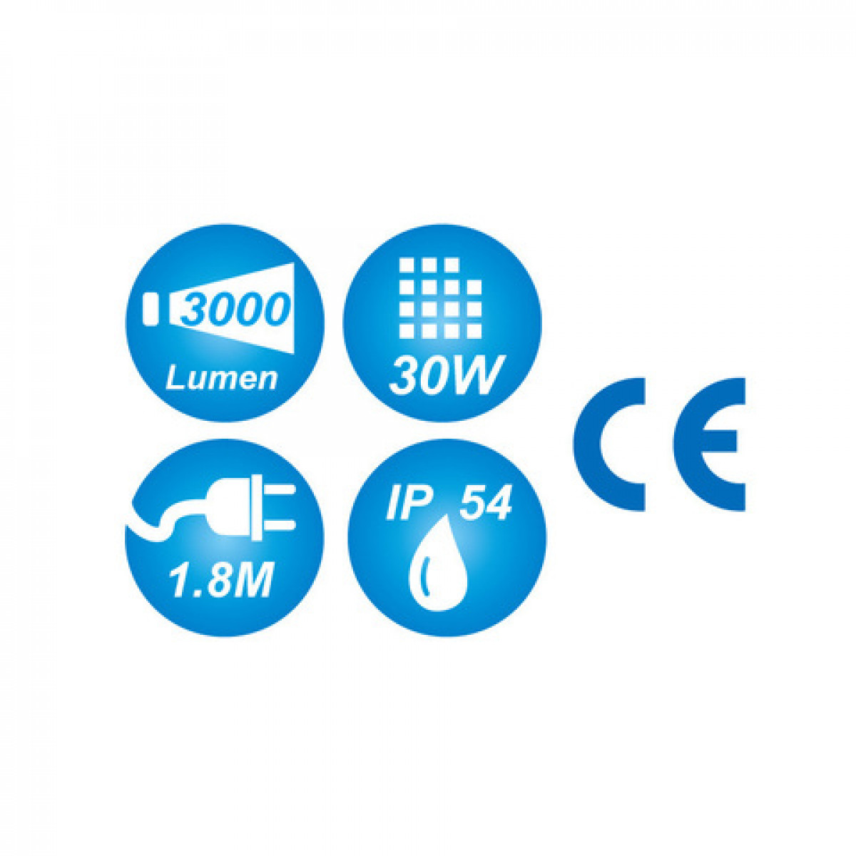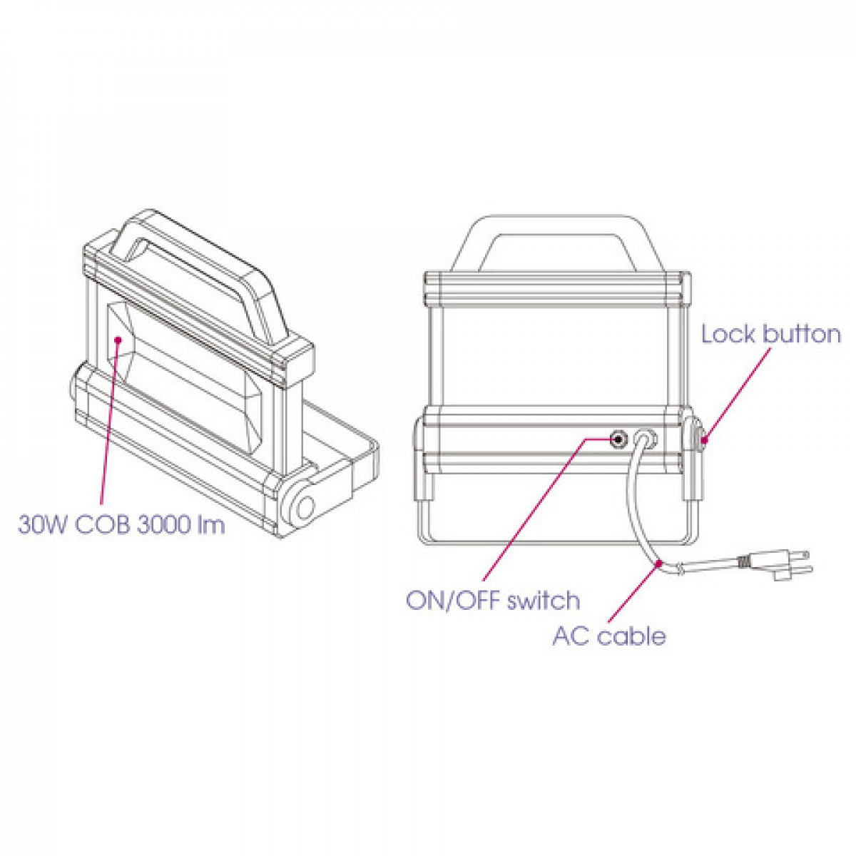 Для своєї високої яскравості (3000 Люмен) електроосвітлювальний прилад споживає всього 30 Вт. Джерелом світла служить масив світлодіодів COB, який дбайливо споживає електроенергію. Для підключення потрібна мережа 100-240 В. Кабель живлення прожектора 1,8 метра. При бажанні, можна купити інвертор та запитати освітлювальний прилад від акумулятора.