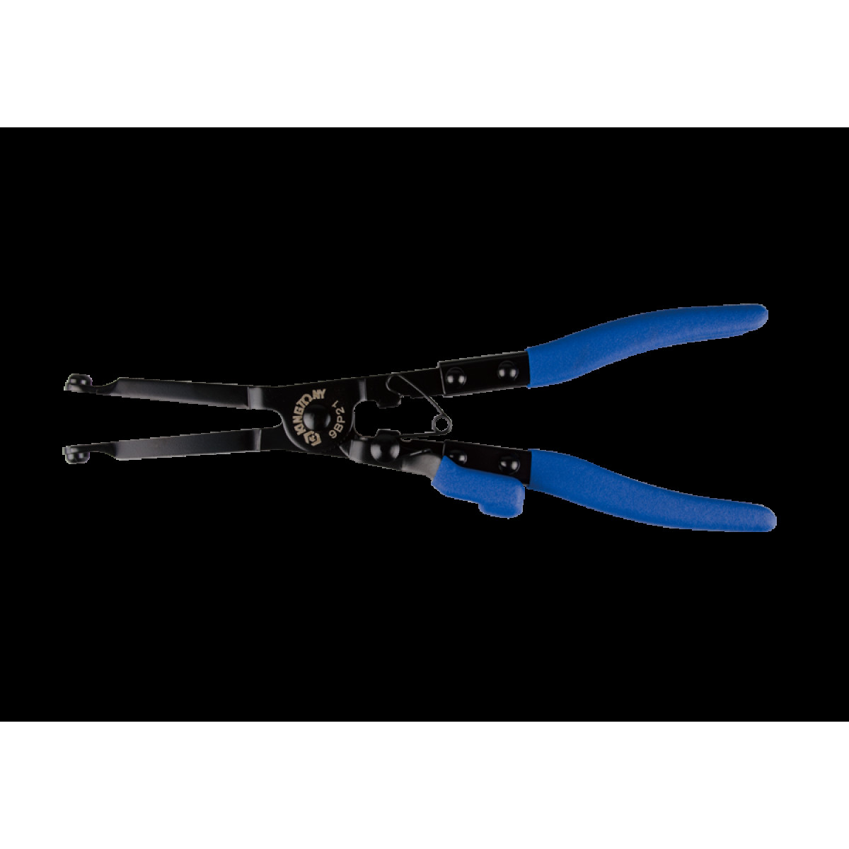 Виготовлені щипці з хромованадієвої сталі. Захисне покриття металевої основи – фосфатний потоплений. Рукоятки виготовлені із пластику, покриття шорстке – ковзання в руках виключене. Є фіксатор знімних губок, що спрощує монтаж та демонтаж хомутів. Наконечники інструменту мають виїмки для зручної фіксації губок хомутів.