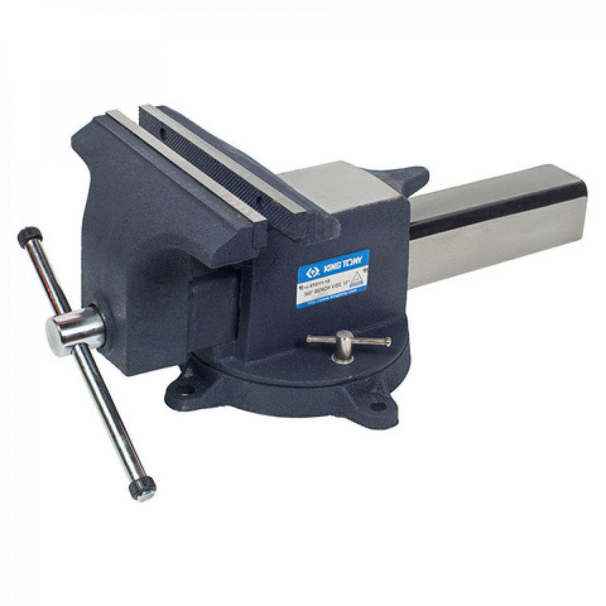 Купити тиски слюсарні Кінг Тоні 9TZ11-06 Особливості цих лещат у зручності експлуатації, надійності та доступній ціні. Конструкцію можна кріпити на будь-який тип поверхні та працювати з габаритними чи дрібними деталями. Корпус лещат виготовлений із сталі (метод лиття). Є захисне покриття основи порошковою фарбою. Гвинт чавунний. Захоплення зубчасте, сталеве, можна використовувати м'які накладки для делікатних операцій. Рукоятка вільно переміщається в головці гвинта. В основі лещат є ковадло для роботи з ударним інструментом. Конструкція розбірна, що обслуговується. Технічні характеристики поворотних лещат King Tony 9TZ11-06: · Загальна довжина лещат – 422 мм.· Ширина (за захоплюючими губками) – 155 мм (6”).· Граничне розсування захватів – 200 мм (хід гвинта). · Вага лещат – 14.5 кг.