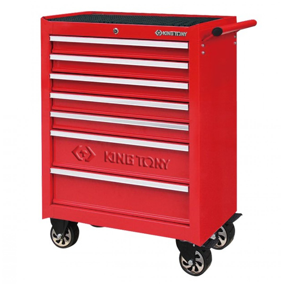 Тумба інструментальна 7 полична червона – елемент спеціалізованих меблів для автосервісу. Мобільна конструкція призначена для зберігання та безпечного транспортування ручного інструменту в межах гаража або станції ТО. У тумби 7 ящиків, що висуваються, сумісних з ложементами під інструмент виробника King Tony. Стільниця у верхній частині конструкції з м'яким покриттям та негабаритним бортиком по периметру перетворює тумбу на мобільний верстат. Місткість, мобільність та простота експлуатації – переваги інструментальної тумби. Конструкція обладнана захисним механізмом, що запобігає втраті інструменту або розкраданню. Колісна база дозволяє тумбі швидко переміщатися гаражем або станцією ТО. Зміщений донизу центр ваги конструкції виключає перекидання тумби. Зручна рукоять спрощує транспортування інструменту приміщення. Легована хромом та ванадієм сталь – секрет успіху компанії King Tony у виготовленні продукції. Міцна та надійна конструкція позбавлена недоліків. Тумба інструментальна 7 полична червона стійка до корозії, фізичних ушкоджень та допускає використання в агресивних середовищах. Ящики захищені тонким шаром піни. Бокова ручка для легкого маневрування. 4 посилені колеса з шарикопідшипниками, у тому числі два поворотні ролики з гальмами. Центральний замок. Висувні ящики на шарикопідшипниках. Вантажопідйомність 240 кг. Вага візка: 51,5 кг. Розміри висувної скриньки (мм): 5 висувних ящиків: 570 x 410 x 74,5 мм 2 висувні ящики: 570 x 410 x 153,5 мм Розмір візка без коліс (мм): 680 x 458 x 856 Розміри візка з колесами (мм): 680 х 458 х 995