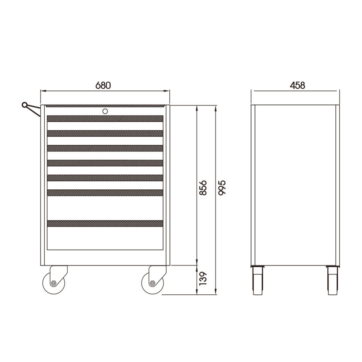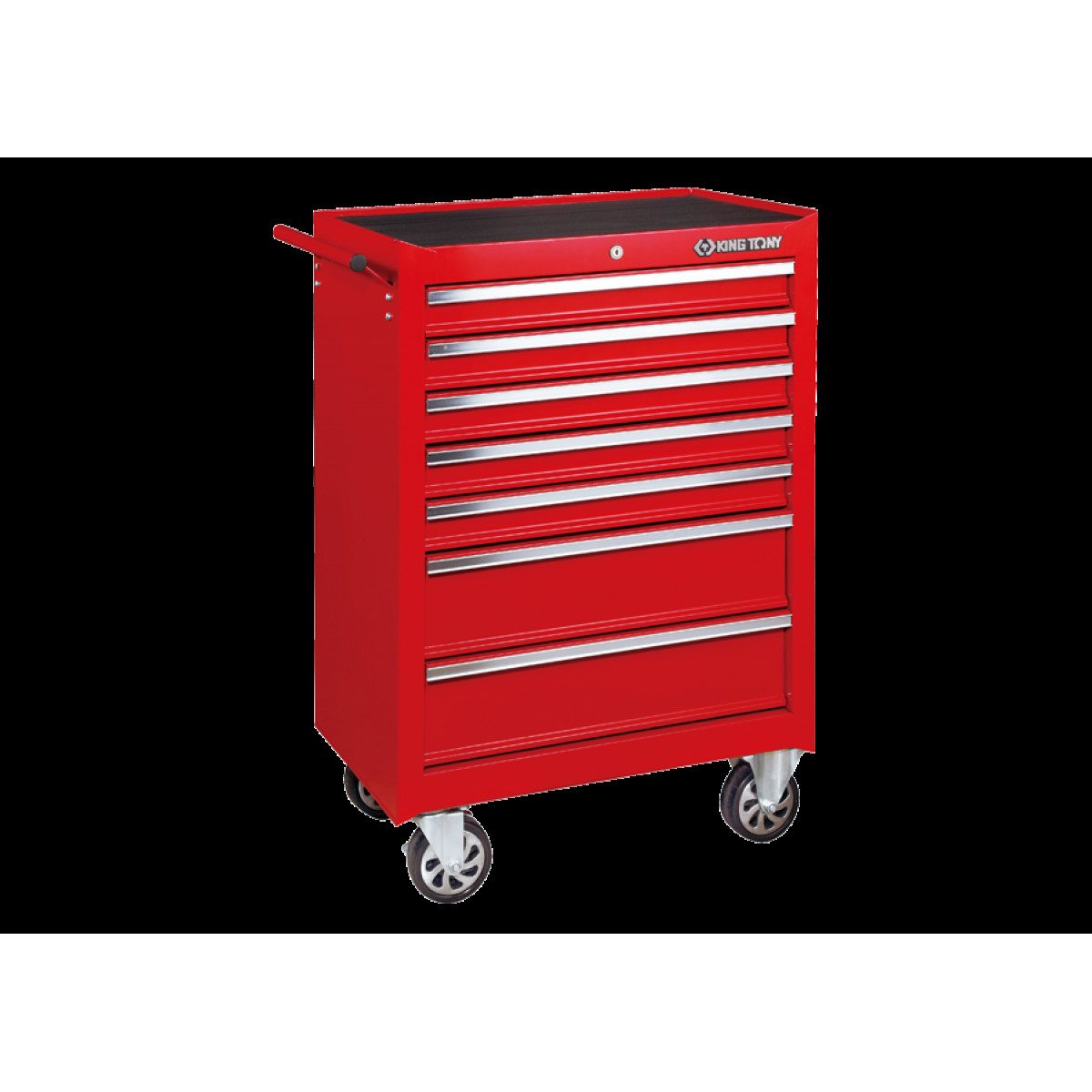 Тумба інструментальна 7 полична червона – елемент спеціалізованих меблів для автосервісу. Мобільна конструкція призначена для зберігання та безпечного транспортування ручного інструменту в межах гаража або станції ТО. У тумби 7 ящиків, що висуваються, сумісних з ложементами під інструмент виробника King Tony. Стільниця у верхній частині конструкції з м'яким покриттям та негабаритним бортиком по периметру перетворює тумбу на мобільний верстат. Місткість, мобільність та простота експлуатації – переваги інструментальної тумби. Конструкція обладнана захисним механізмом, що запобігає втраті інструменту або розкраданню. Колісна база дозволяє тумбі швидко переміщатися гаражем або станцією ТО. Зміщений донизу центр ваги конструкції виключає перекидання тумби. Зручна рукоять спрощує транспортування інструменту приміщення. Легована хромом та ванадієм сталь – секрет успіху компанії King Tony у виготовленні продукції. Міцна та надійна конструкція позбавлена недоліків. Тумба інструментальна 7 полична червона стійка до корозії, фізичних ушкоджень та допускає використання в агресивних середовищах. Ящики захищені тонким шаром піни. Бокова ручка для легкого маневрування. 4 посилені колеса з шарикопідшипниками, у тому числі два поворотні ролики з гальмами. Центральний замок. Висувні ящики на шарикопідшипниках. Вантажопідйомність 240 кг. Вага візка: 51,5 кг. Розміри висувної скриньки (мм): 5 висувних ящиків: 570 x 410 x 74,5 мм 2 висувні ящики: 570 x 410 x 153,5 мм Розмір візка без коліс (мм): 680 x 458 x 856 Розміри візка з колесами (мм): 680 х 458 х 995