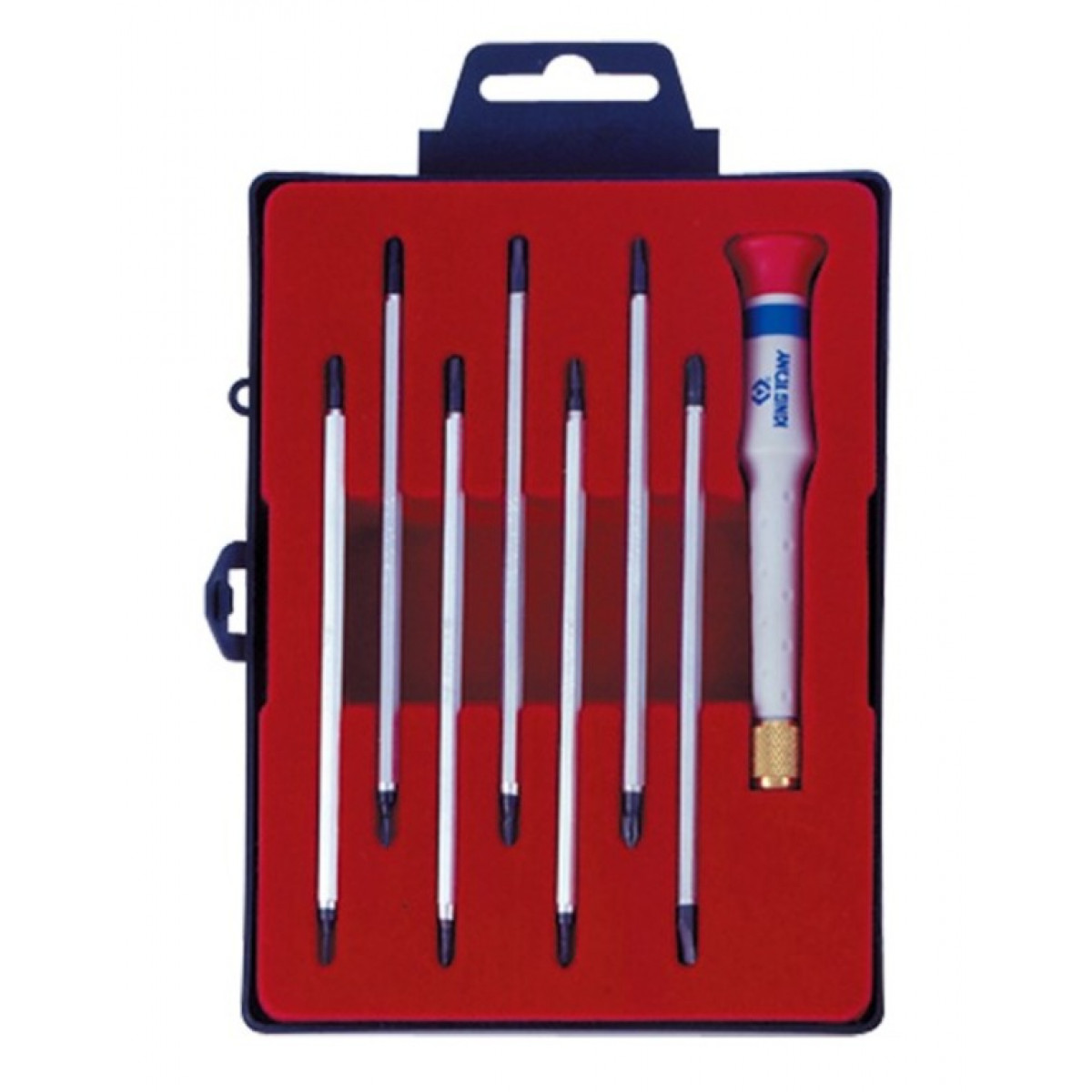 Набір викруток прецизійних KING TONY 32607MR призначений для точних робіт з кріпленням малого розміру. Набір стане чудовим помічником для роботи у сфері точної механіки та електроніки. Для зручності зберігання та транспортування передбачений футляр. Особливості набору • Довжина ручки (91230): 100 мм. • Довжина двосторонніх вставок (2431, 2433): 120 мм. • У наборі представлено 7 двосторонніх вставок. • Високоточна обробка намагнічених наконечників дає ідеальний контакт із кріпленням. • Ергономічна рукоятка PP стійка до дії масел, бензину, кислот та лугів. • Матеріал робочої частини вставок SNCM+V – легована сталь із додаванням молібдену, покриття хром. Комплектація Хрестові Phillips 2431 PH00 х 120 мм PH0 х 120 мм PH1 х 120 мм Шлицеві Slotted 2431 SL2.0 х 120 мм SL3.0 х 120 мм SL4.0 х 120 мм TORX 2433 T6 х 120 мм T7 х 120 мм T8 х 120 мм T9 х 120 мм T10 х 120 мм T15 х 120 мм T20 х 120 мм