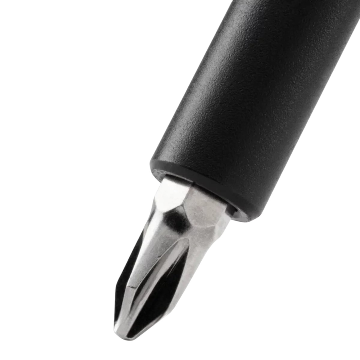 Магнитный держатель фиксирует биту и крепёж, а чёрный хром защищает стержень от коррозии.