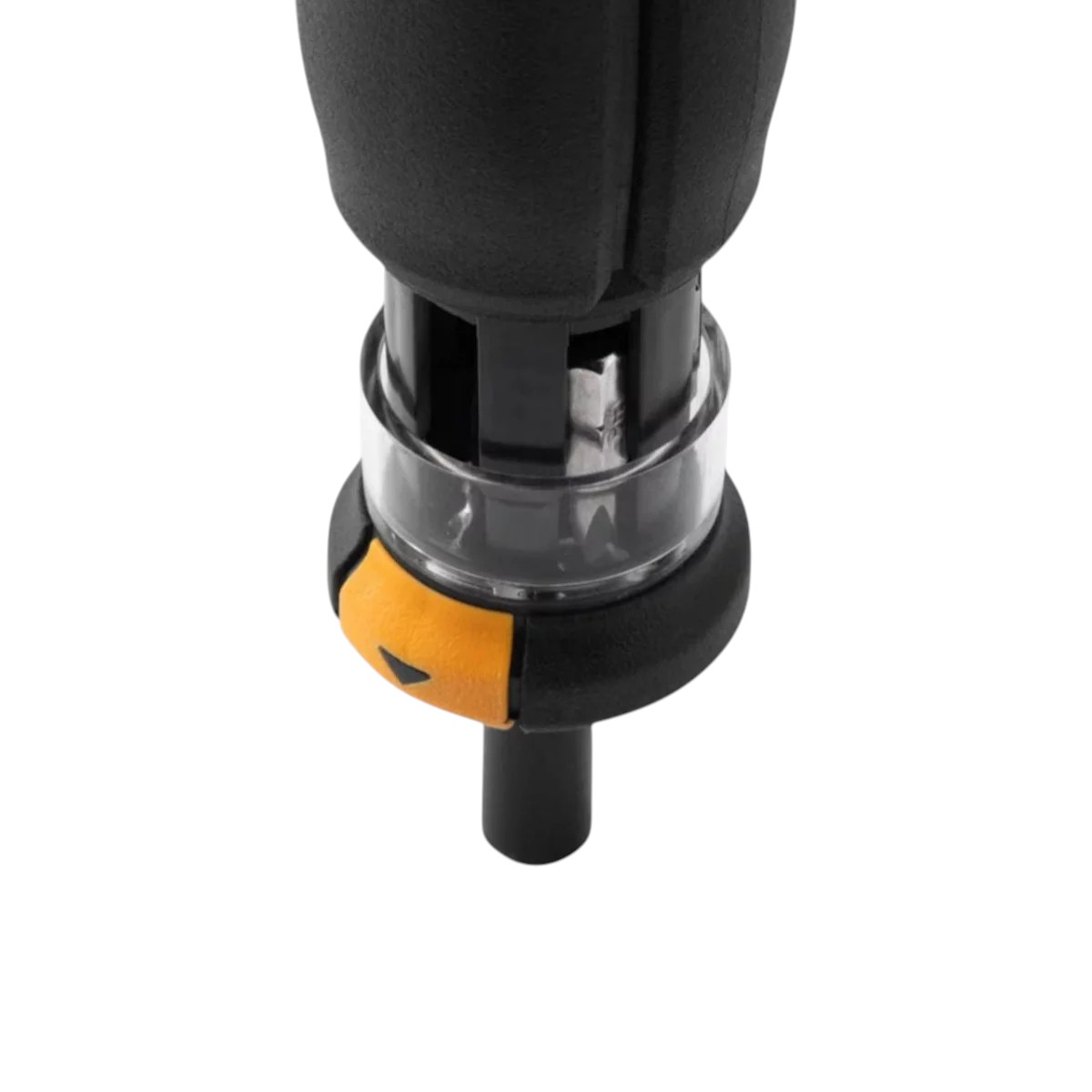 Инструмент для тех, кто ценит скорость, удобство и надёжность. Помповый механизм автозагрузки мгновенно меняет биты, прозрачное окошко показывает доступные насадки, а трёхгранная прорезиненная рукоятка даёт контроль и комфорт. Чёрный хромованный стержень устойчив к коррозии и серьёзной нагрузке.