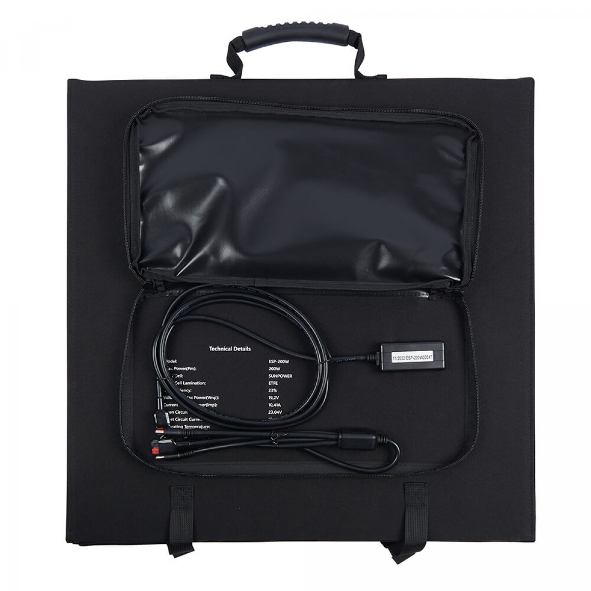 Конструкція включає опорну підніжку для легкого налаштування кута нахилу та отримання максимальної енергії протягом дня. Високий клас вологозахисту (IP67) та міцний матеріал забезпечують довговічність та стійкість до зовнішніх впливів. У комплекті постачається зарядний кабель для прямого підключення до зарядних станцій. Обирайте EnerSol ESP-200W для потужної, мобільної та екологічно чистої зарядки.